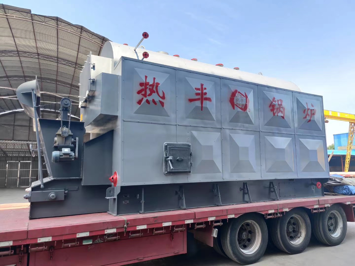 生物質蒸汽鍋(guō)爐兩側(cè)布置水(shuǐ)冷壁(bì)構成爐膛及對流煙道,蒸汽鍋爐鍋筒內布(bù)置有單回(huí)程(chéng)螺紋煙管。爐膛內采用水冷整(zhěng)澆(jiāo)的前拱、後拱。前拱為階梯形(xíng),後拱為(wéi)人字形,使拱(gǒng)的覆蓋率(lǜ)接(jiē)近85,有利於生物質燃料的燃燒。采用大塊式鏈條爐排實現機械式燃燒。配鼓引風機進行機(jī)械通風,並配以出渣機實(shí)現機械出渣,控(kòng)製監測儀表齊全。
